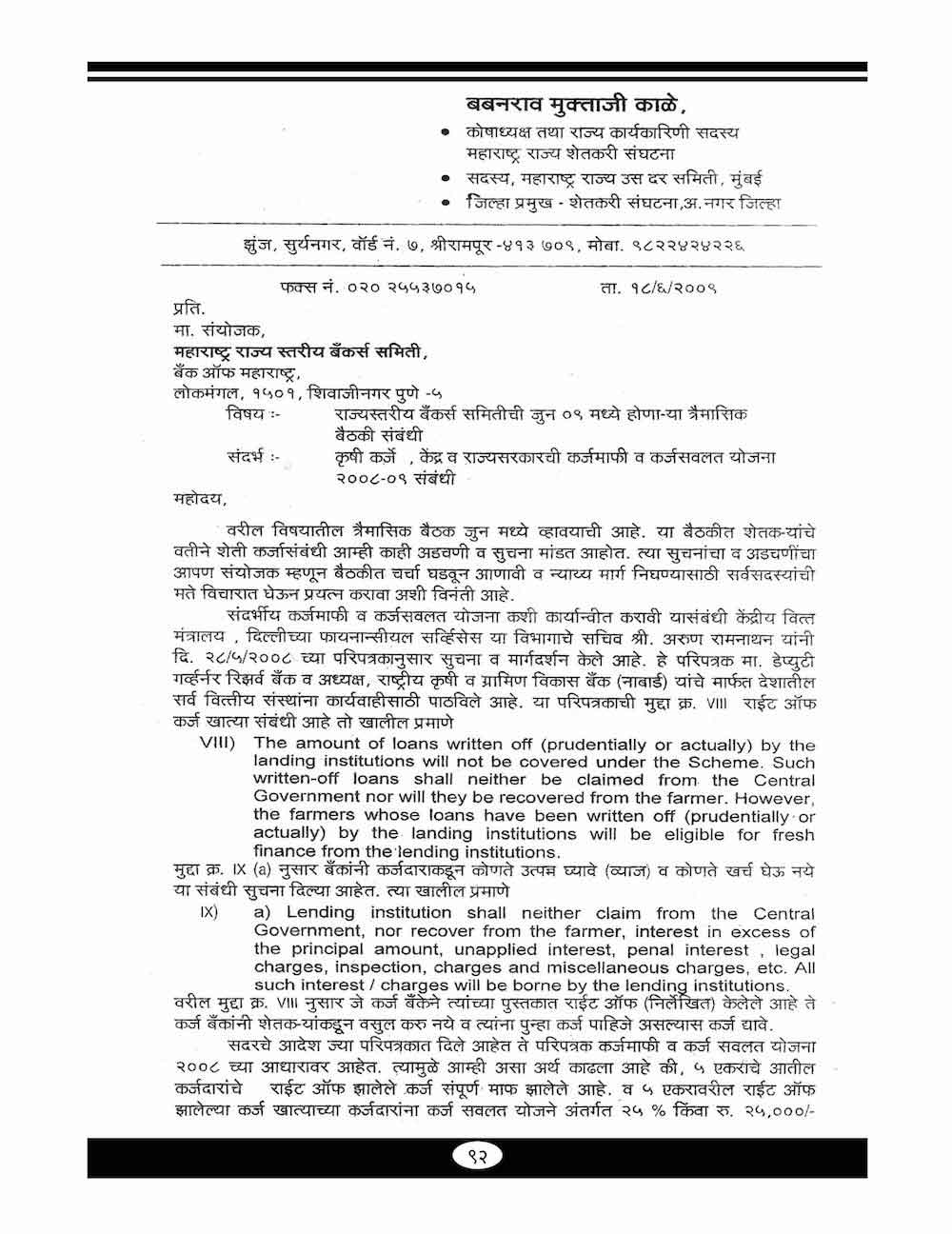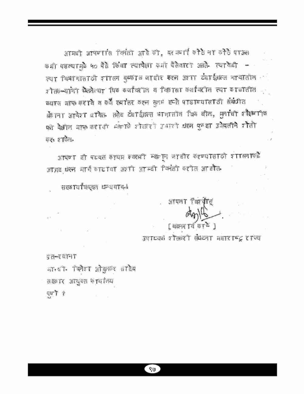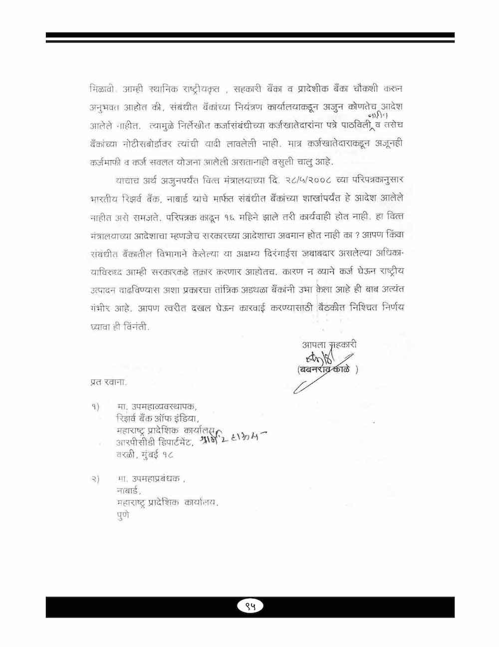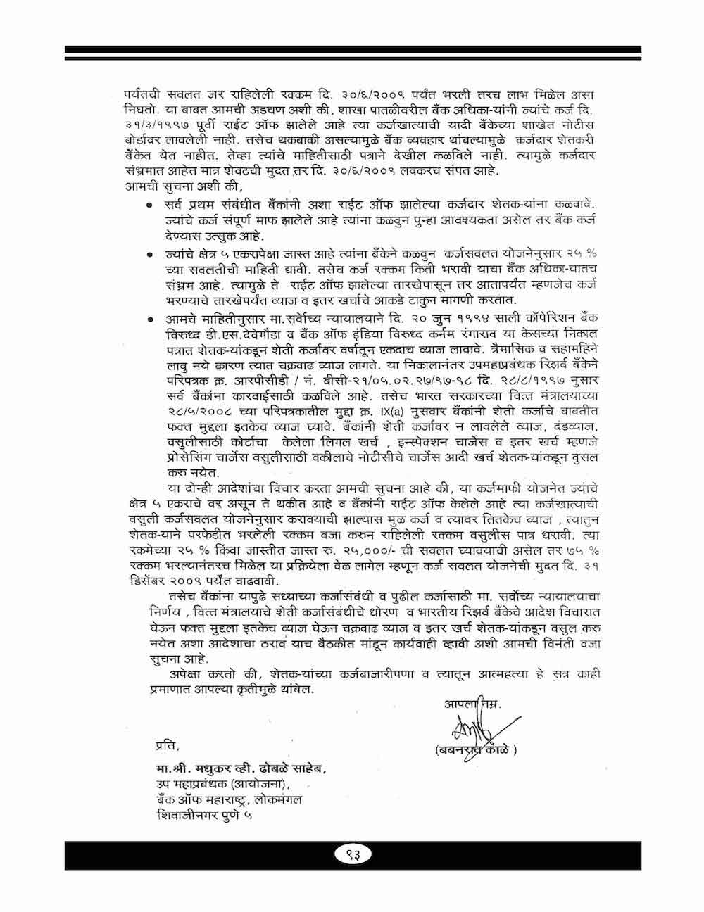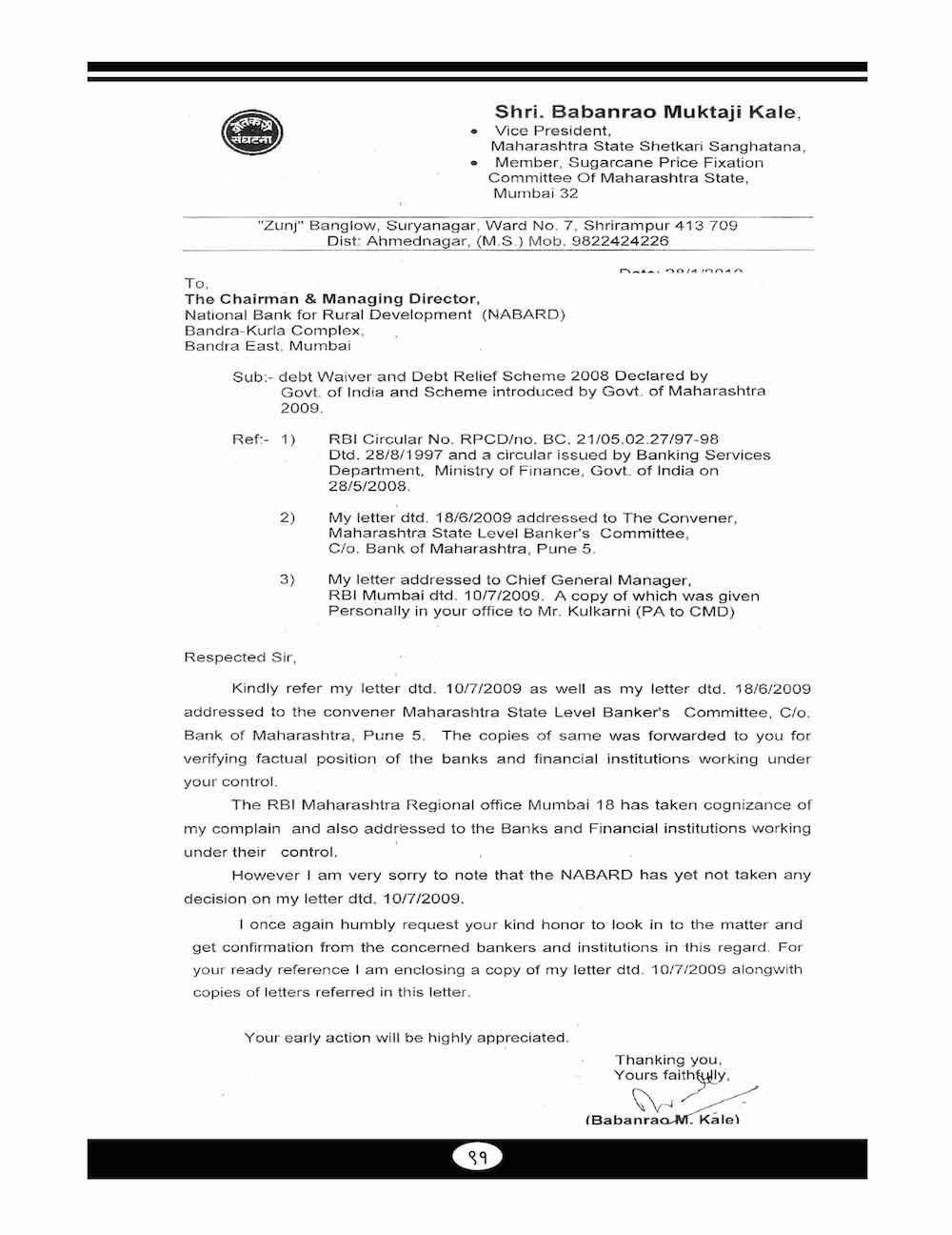 स्व. बबनरावजी काळे यांनी कर्ज माफी संदर्भात केलेले महत्वाचे पत्रव्यवहार-८९