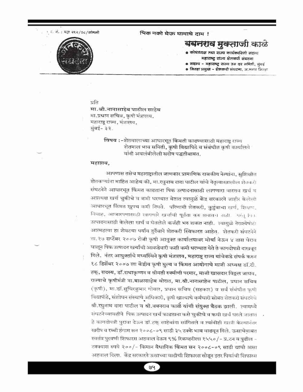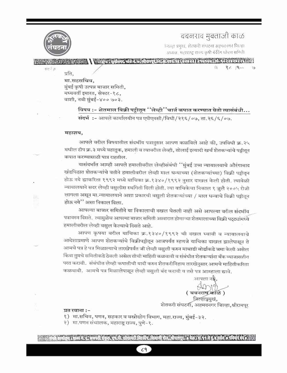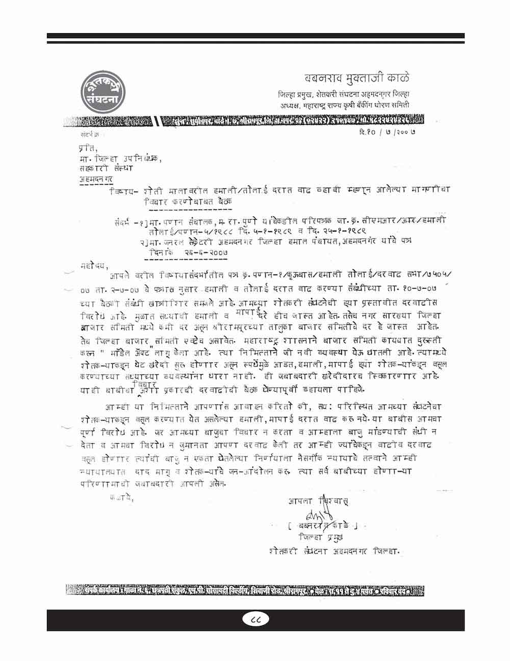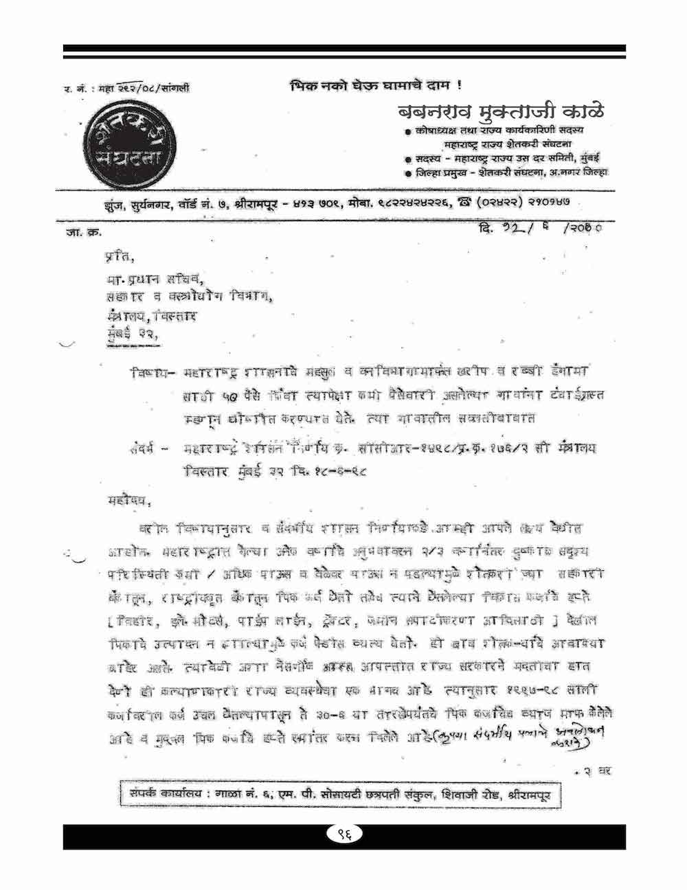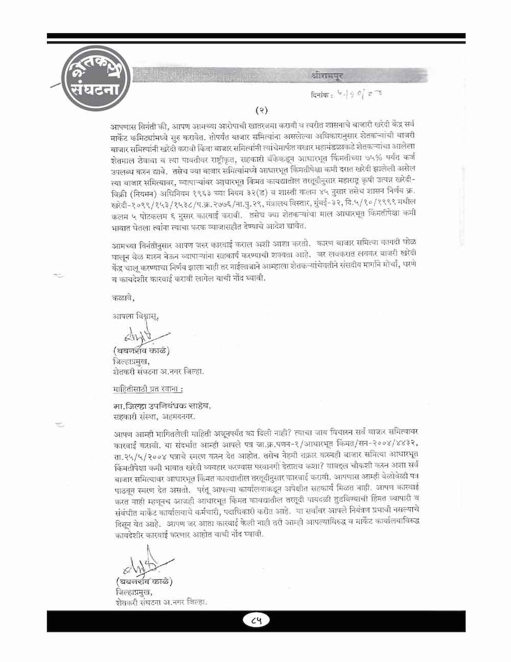 स्व. बबनरावजी काळे यांनी शेतकऱ्यांच्या विविध प्रश्न संदर्भात केलेले महत्वाचे पत्रव्यवहार - ६७