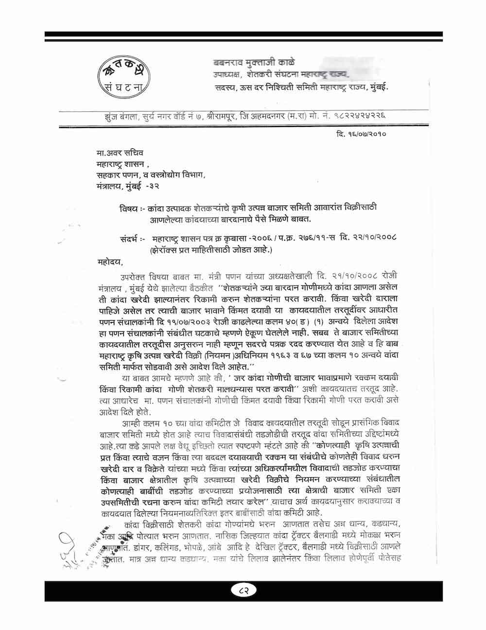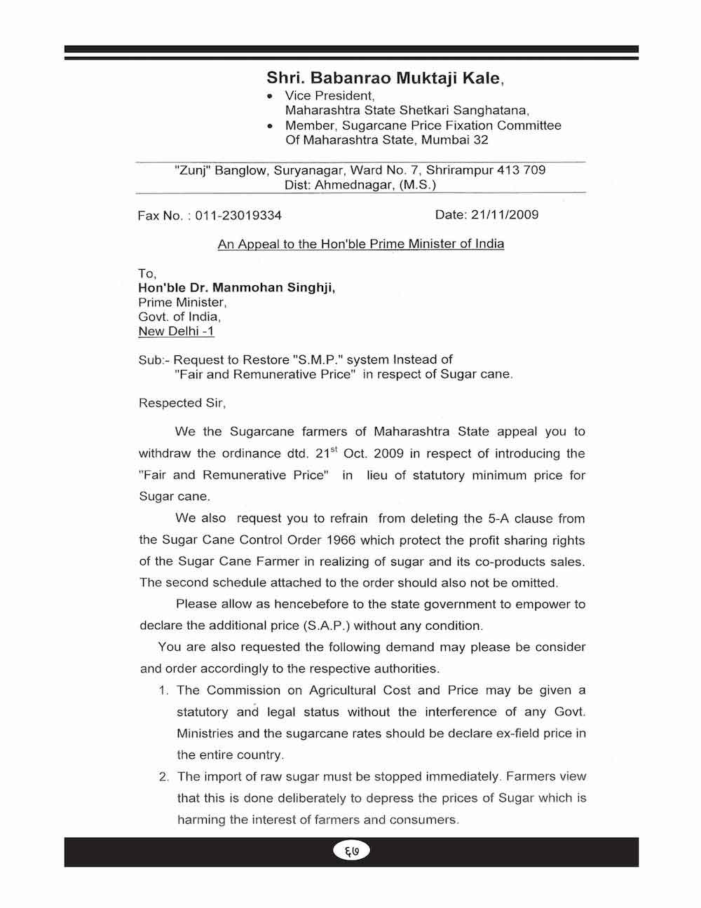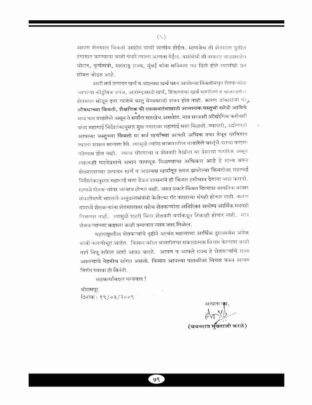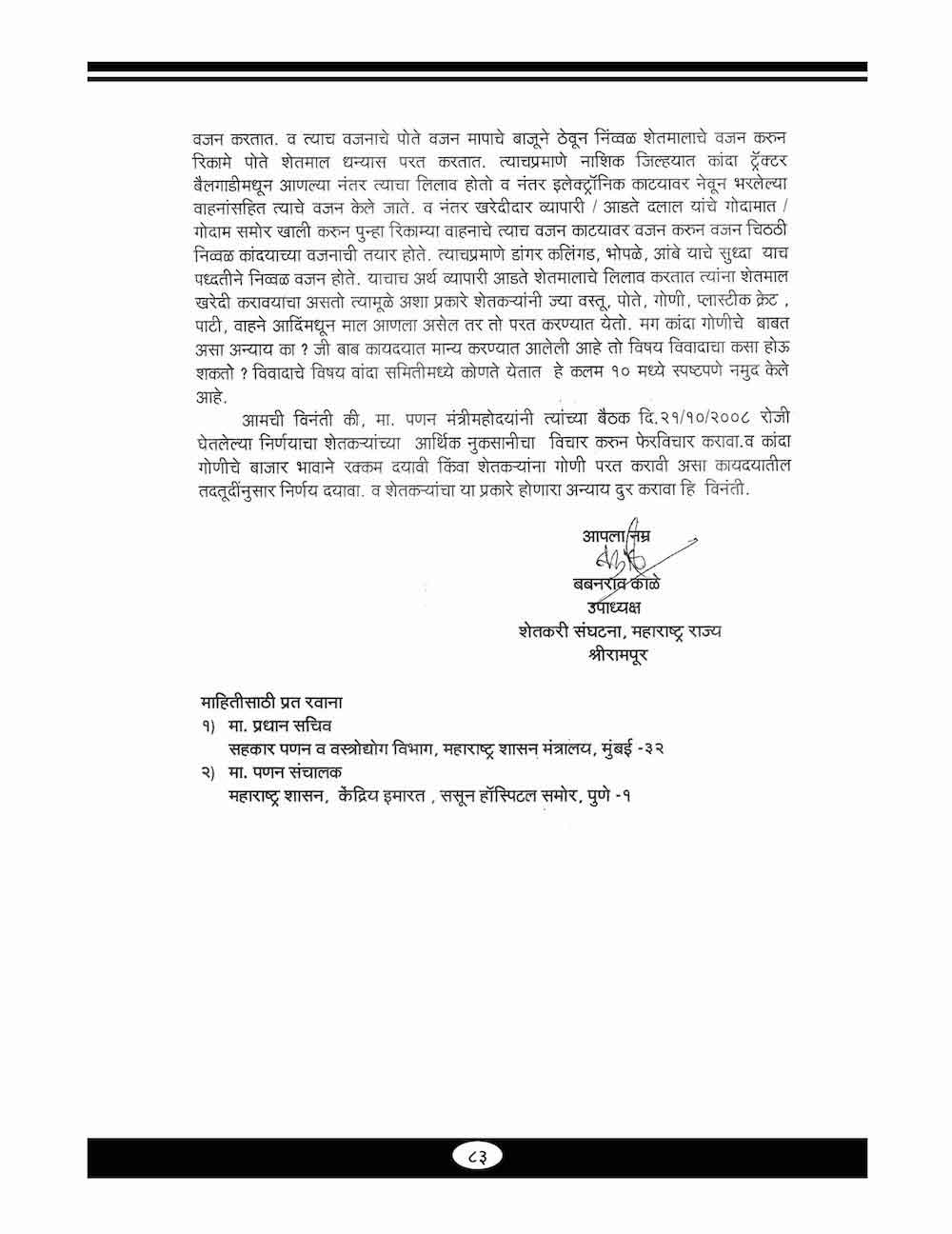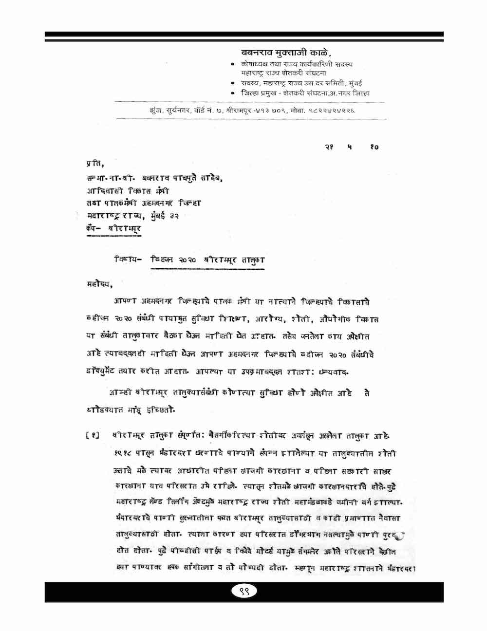 स्व. बबनरावजी काळे यांनी शेतकऱ्यांच्या विविध प्रश्न संदर्भात केलेले महत्वाचे पत्रव्यवहार - ६७