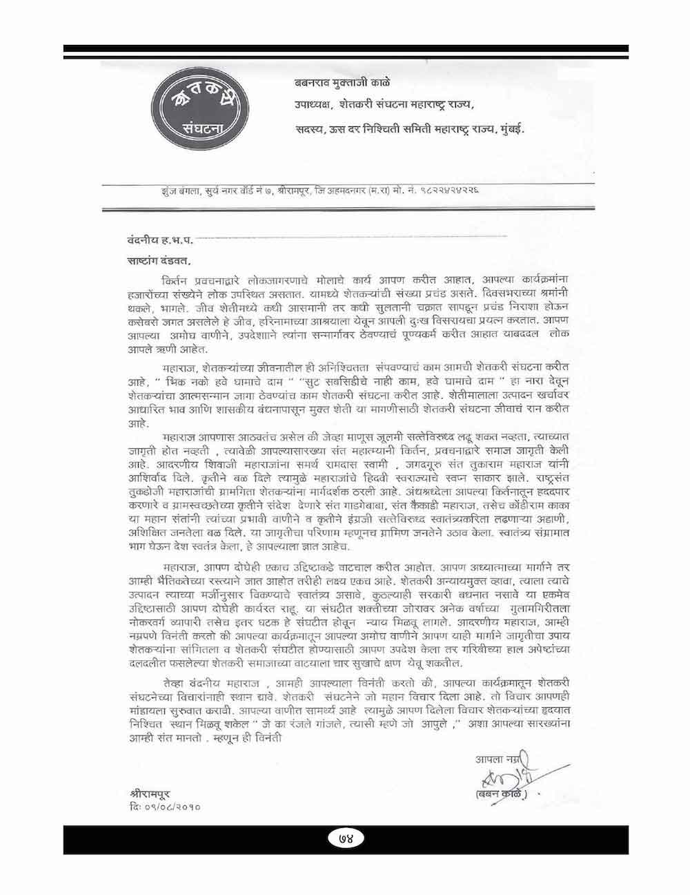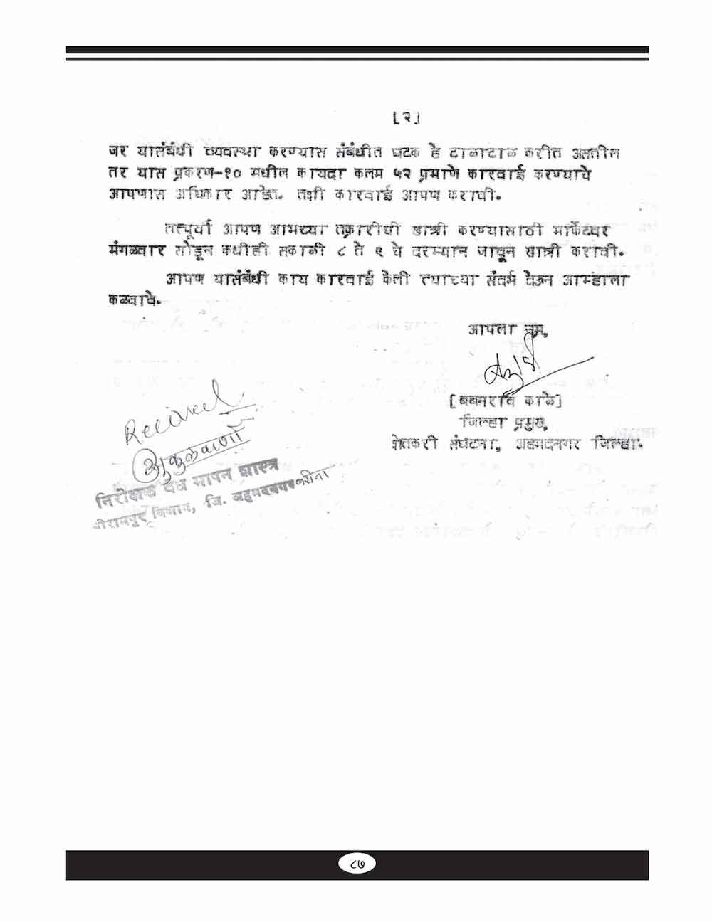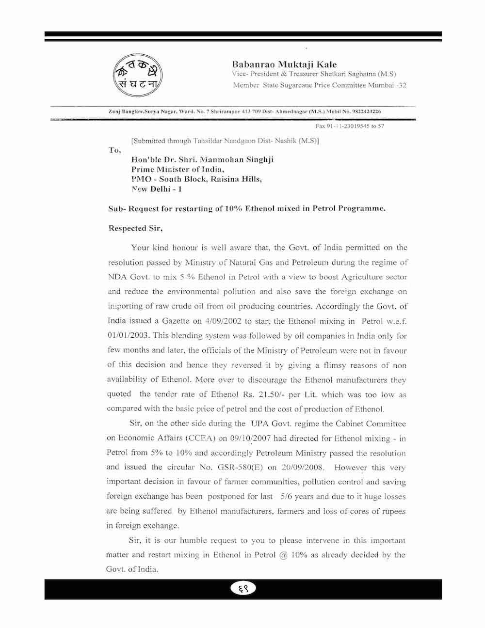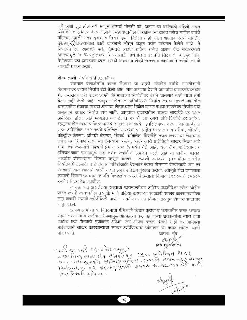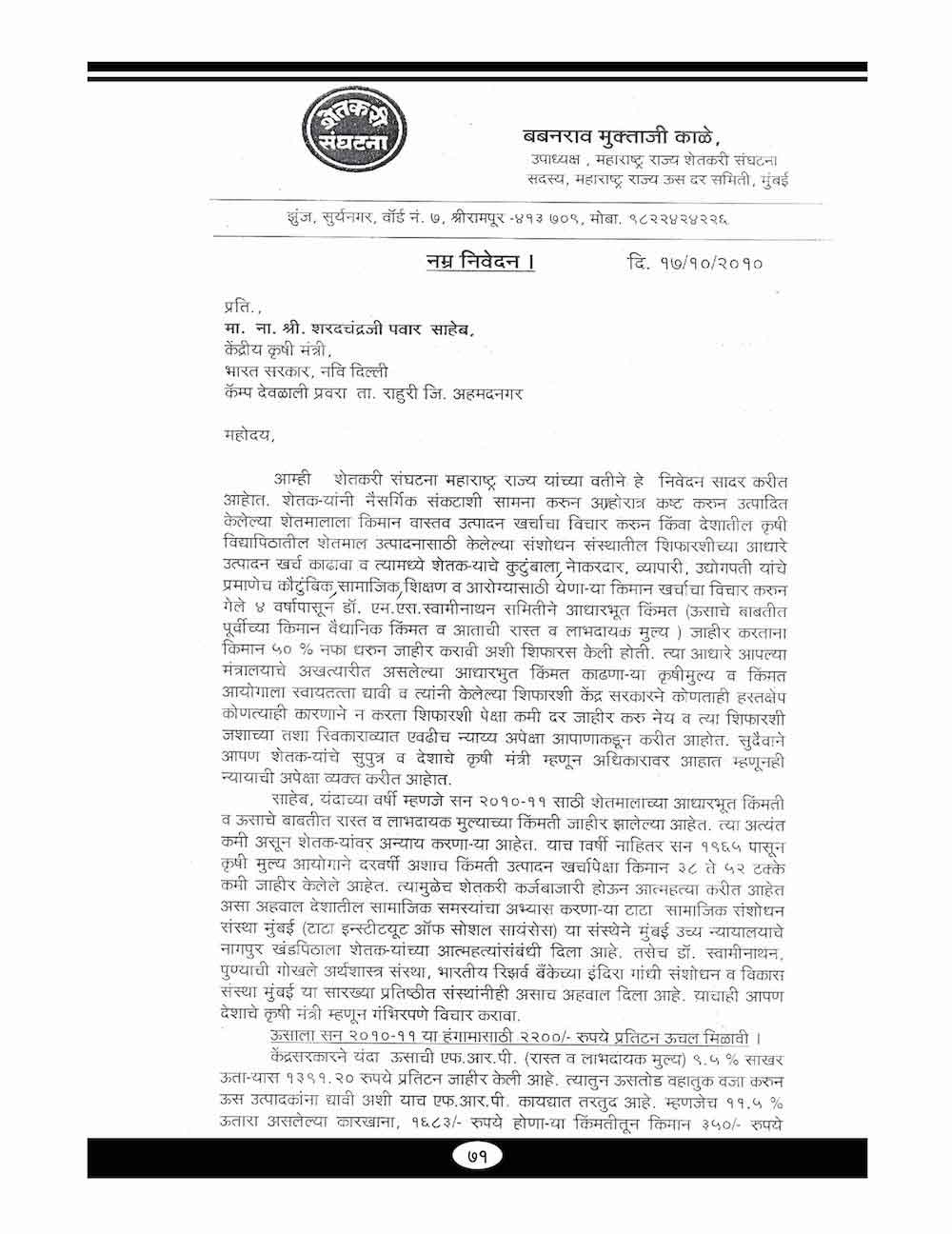 स्व. बबनरावजी काळे यांनी शेतकऱ्यांच्या विविध प्रश्न संदर्भात केलेले महत्वाचे पत्रव्यवहार - ६७