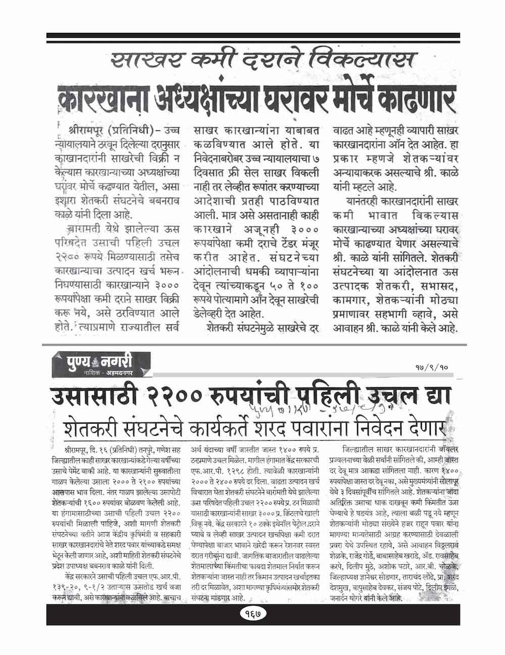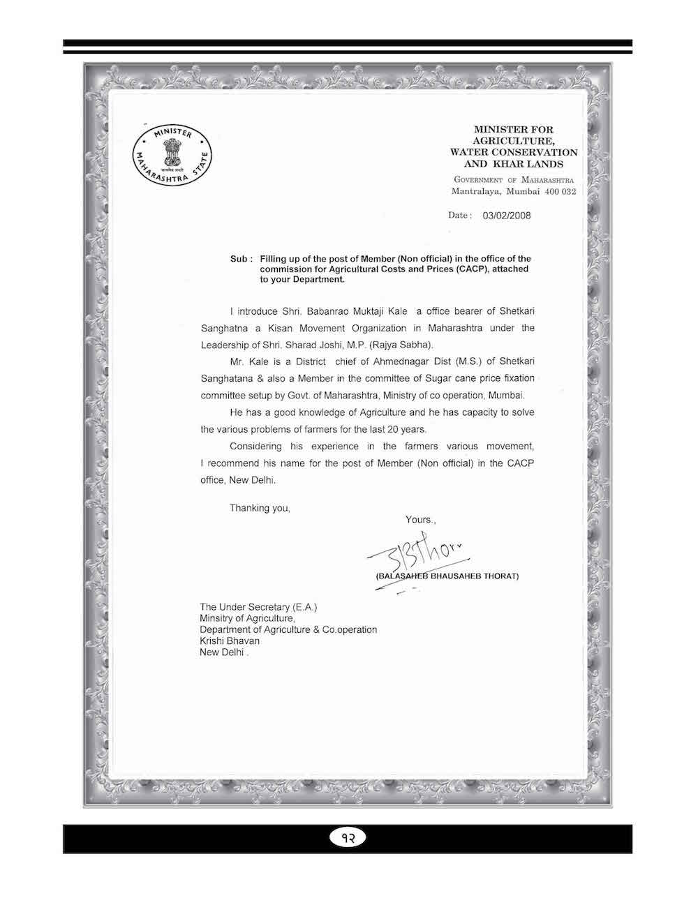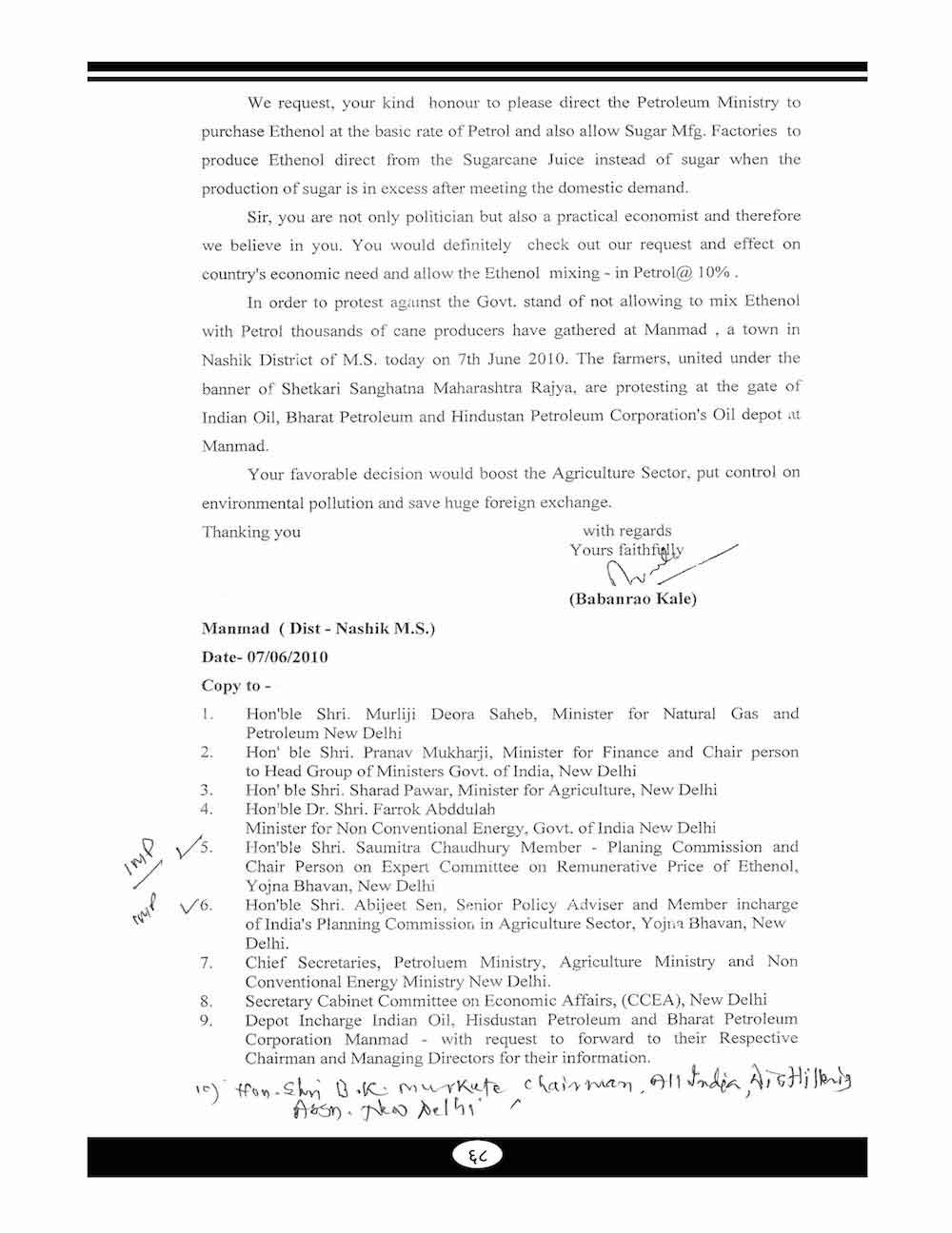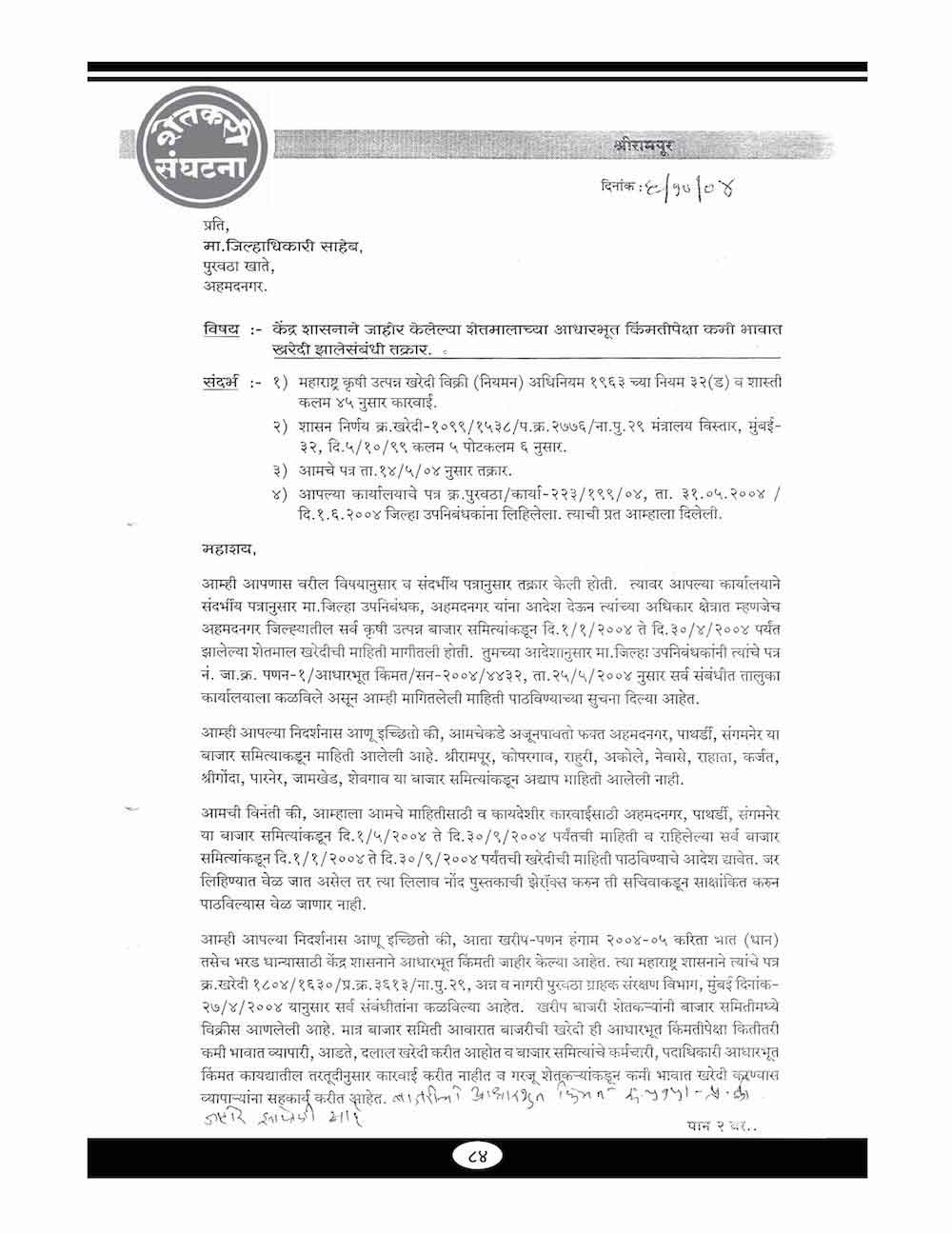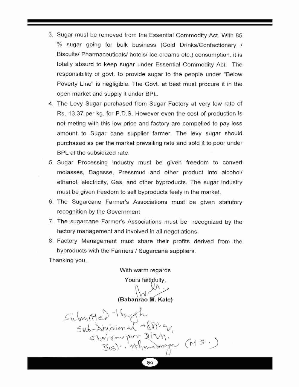 स्व. बबनरावजी काळे यांनी शेतकऱ्यांच्या विविध प्रश्न संदर्भात केलेले महत्वाचे पत्रव्यवहार - ६७