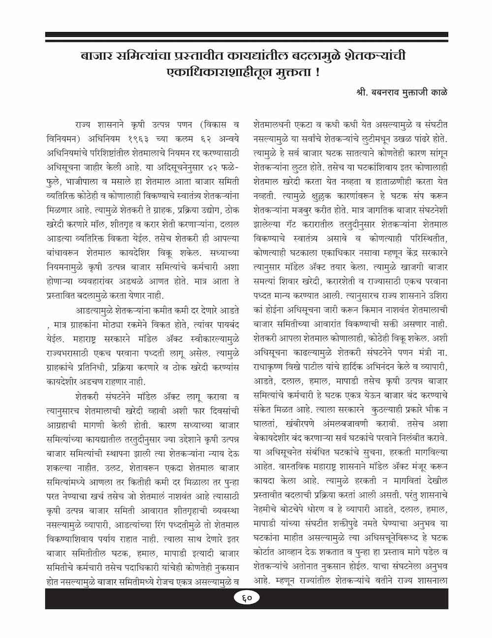 बाजार समित्यांचा प्रस्तावित कायद्यातील बदलामुळे शेतकऱ्यांची एकाधीकाराशाहीतून मुक्तता! - ६०