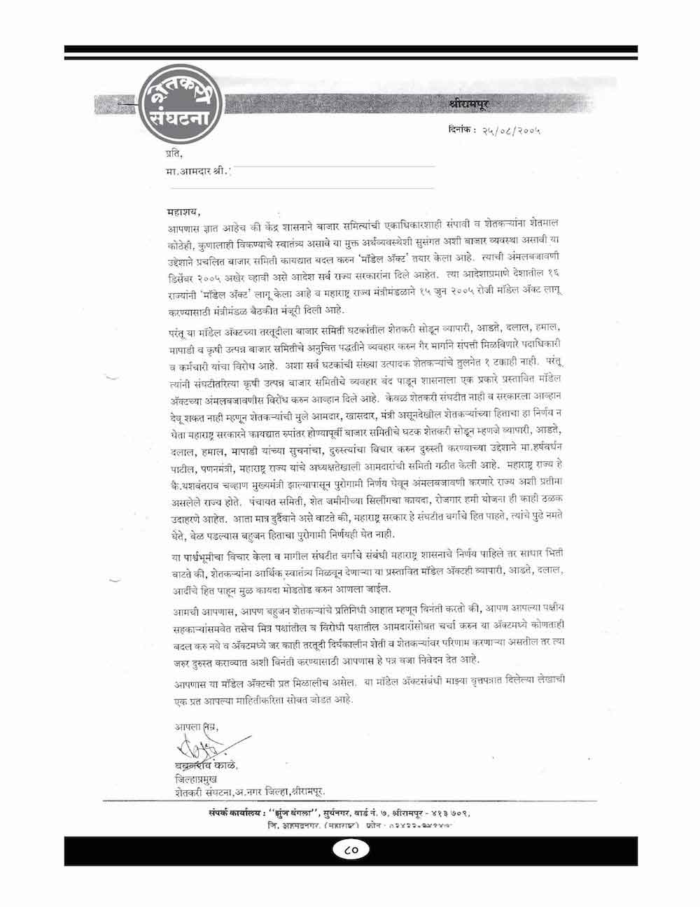 स्व. बबनरावजी काळे यांनी बाजार समितीच्या प्रश्न संदर्भात केलेले महत्वाचे पत्रव्यवहार - ८०